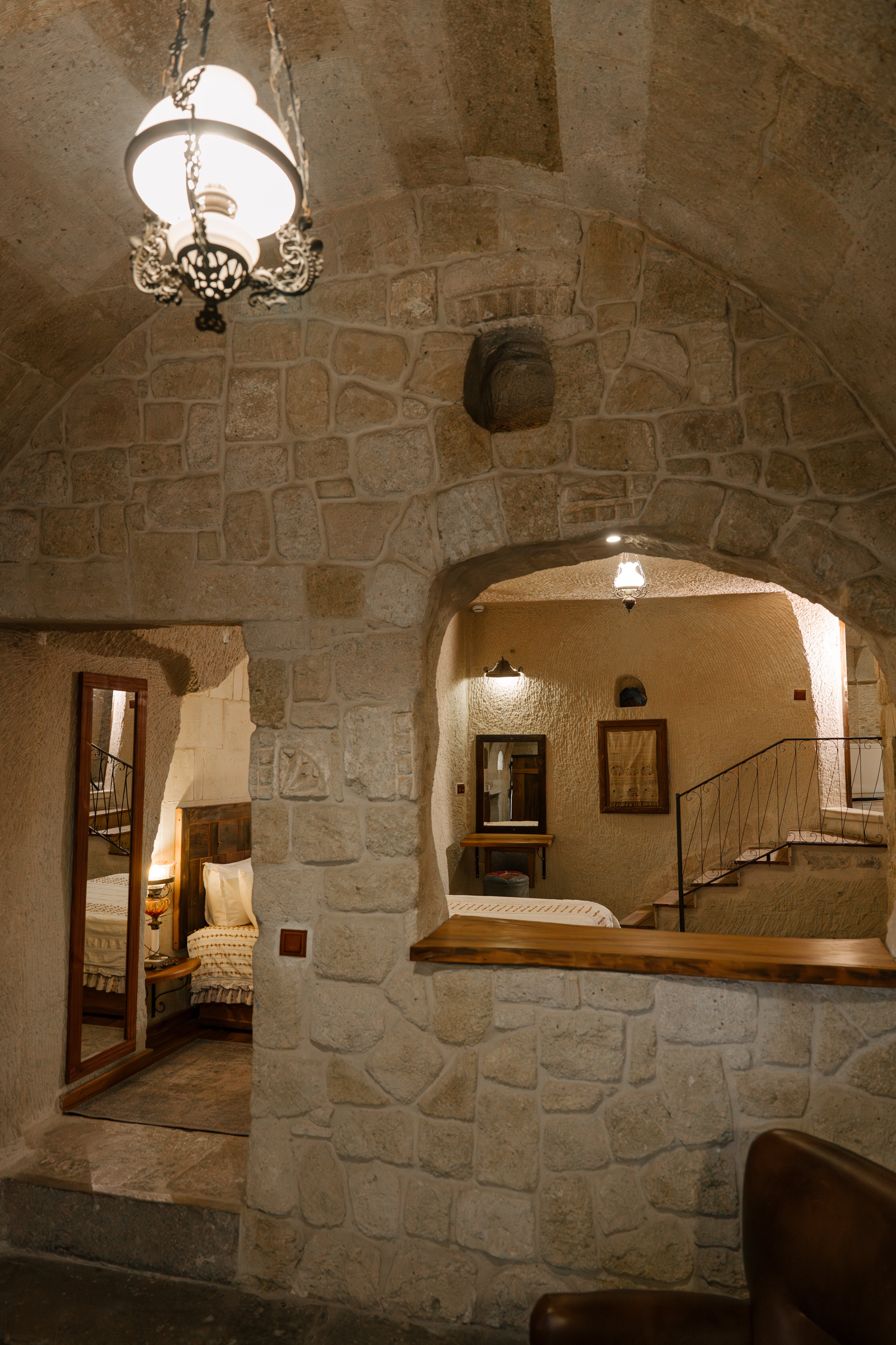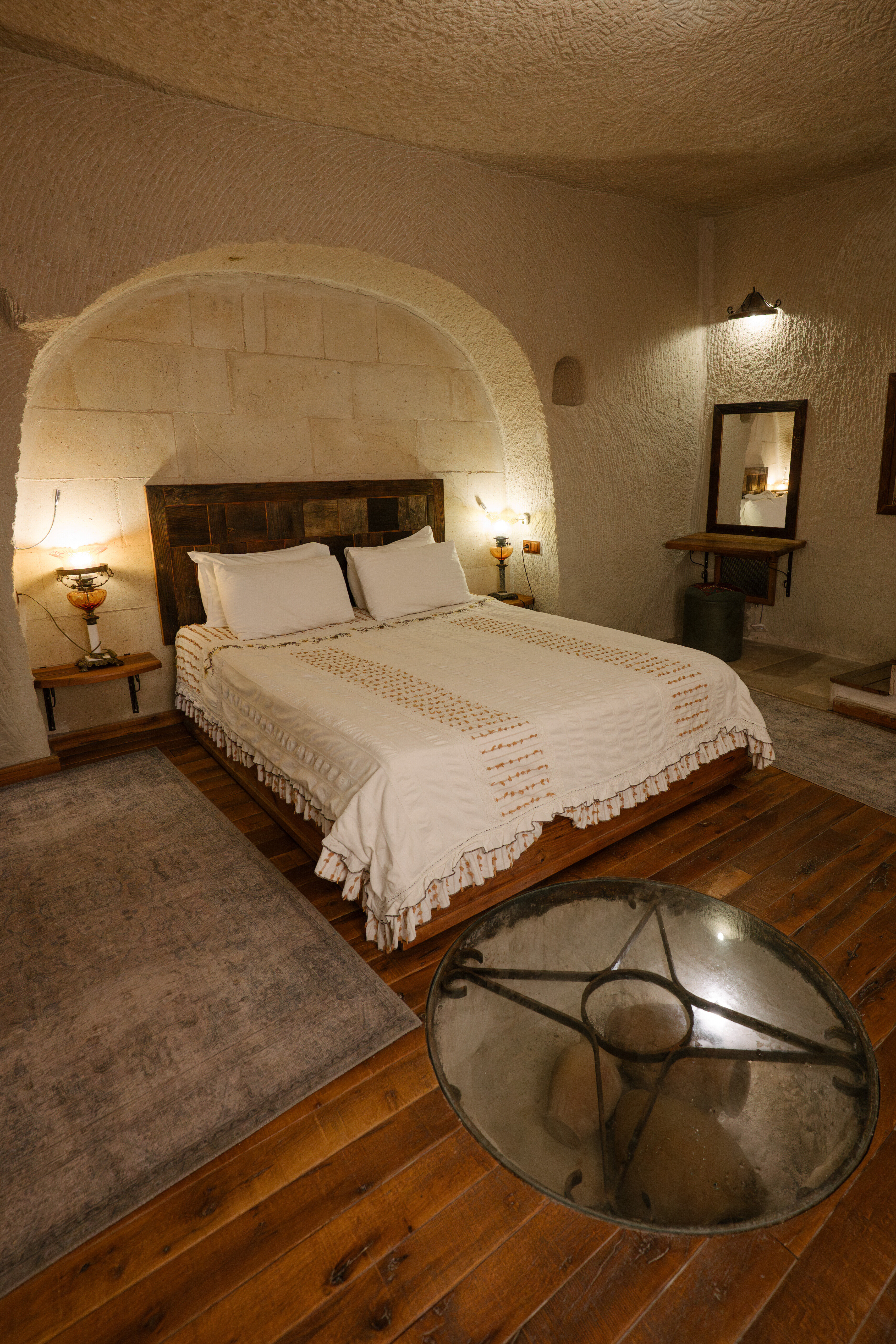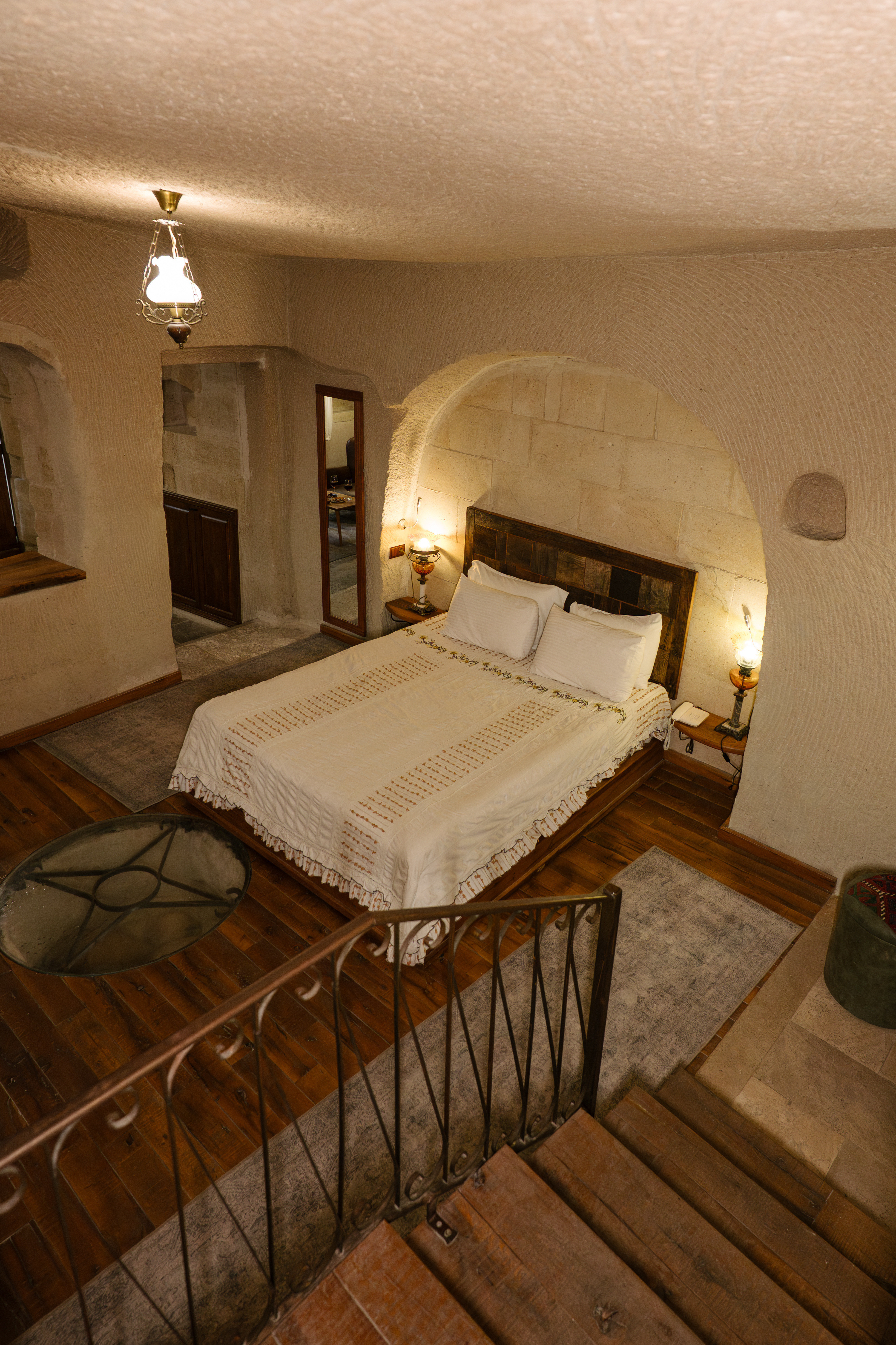 Mağara mimarisi French bed/Super King Size (180cm x 200cm) Küvet ve duş Ahşap ve traverten zeminli mağara oda